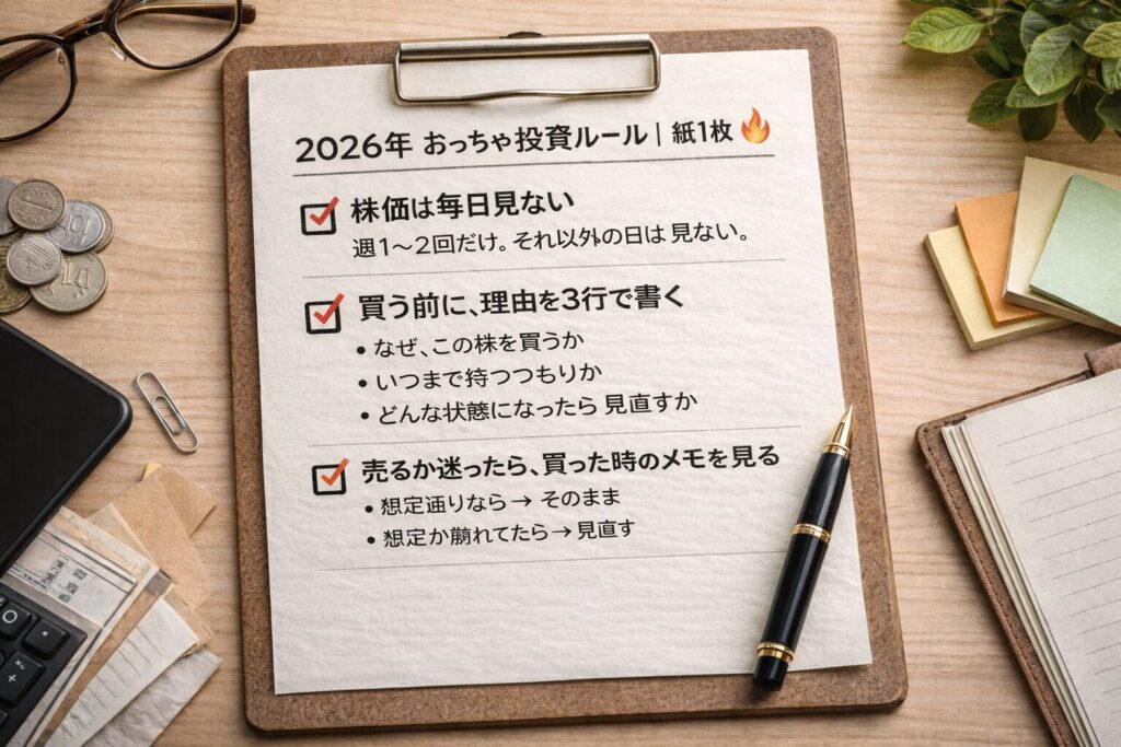 投資で迷っていた60代初心者が、投資ルールを紙1枚に整理。買う前の3行メモと株価を見すぎない運用で、判断が楽になった実体験を紹介します。