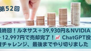 ChatGPT×投資記録チャレンジ 【第52回】最終回!ルネサス+39,930円&NVIDIA+12,997円で売却完了!📈 ChatGPT投資チャレンジ、最後までやり切りました ChatGPTの助言で購入したルネサスエレクトロニクスとNVIDIAを12月25日に売却。合計約53,000円のプラスでiPhone 16 Plusの軍資金を確保した、60歳まじかのおっちゃんによる最終投資記録。 2025.12.25 ChatGPT×投資記録チャレンジ株式投資